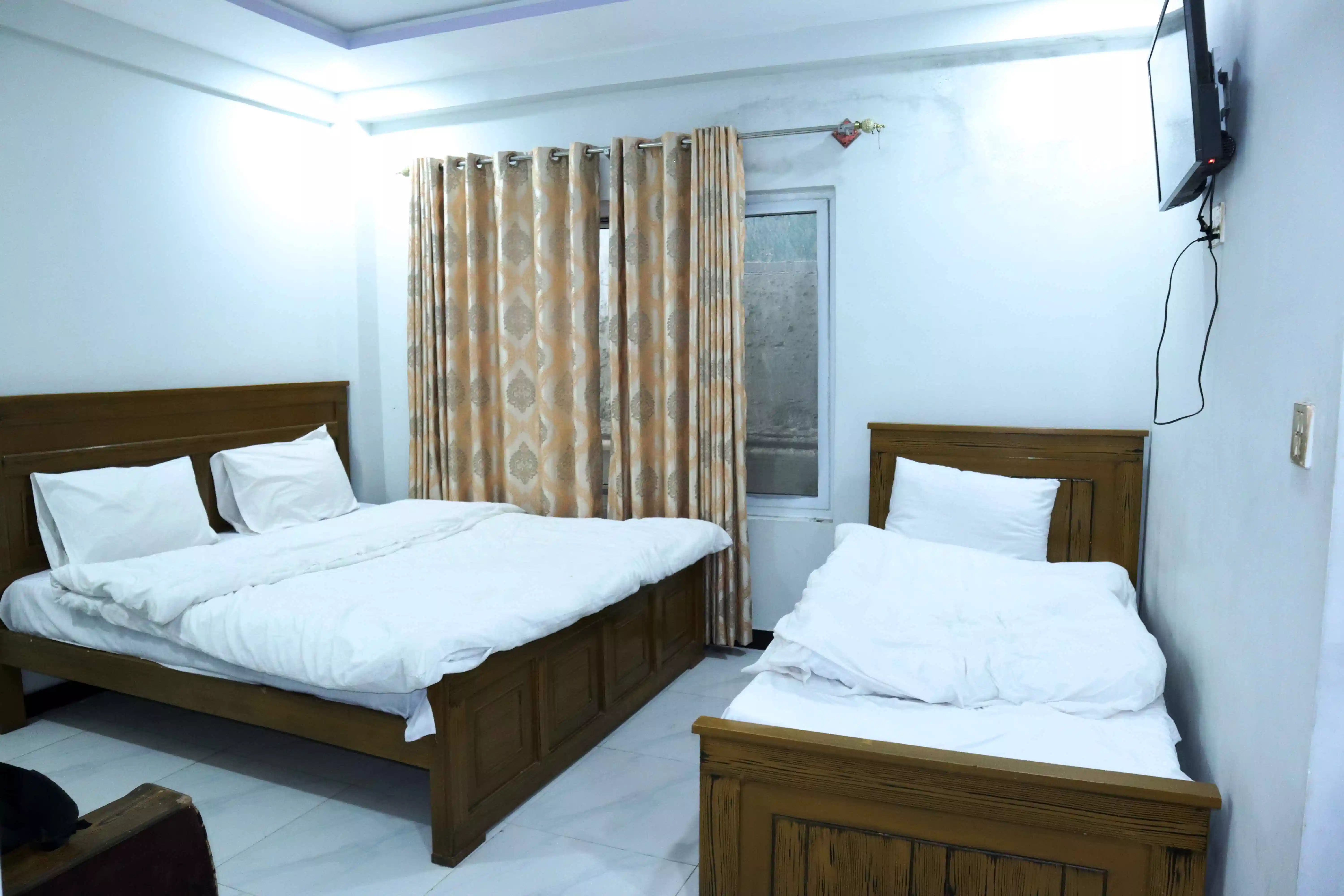 A comfortable room with one double bed and two single beds, attached bath, free Wi-Fi, and scenic view. Ideal for families or small groups seeking a cozy stay near Mall Road.